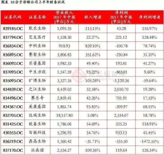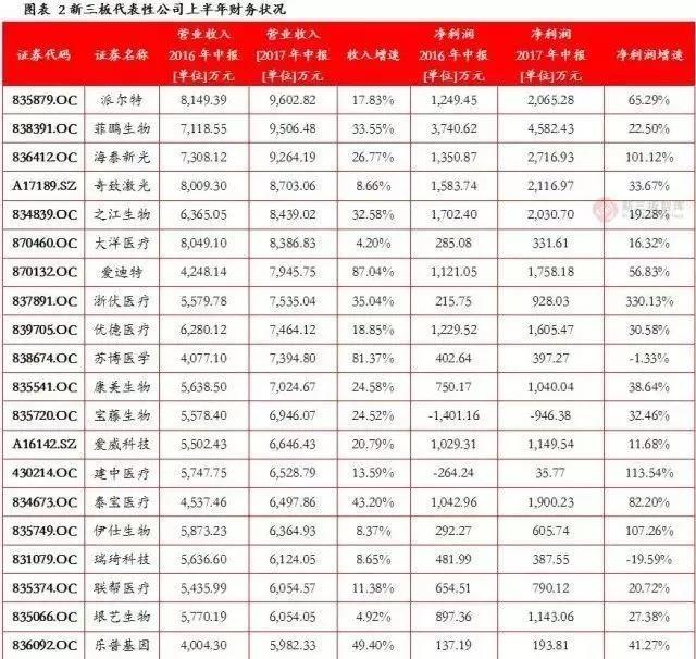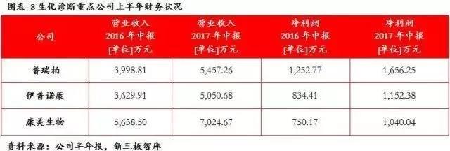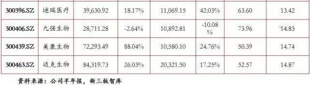 新三板整体虽然在营收和净利润体量上小于主板公司,但是业绩增速更胜一筹,整体业绩增长速度快于体量更大的主板公司。其中普瑞柏、伊普诺康和康美生物上半年业绩表现最为出众,财务数据如下表所示:
