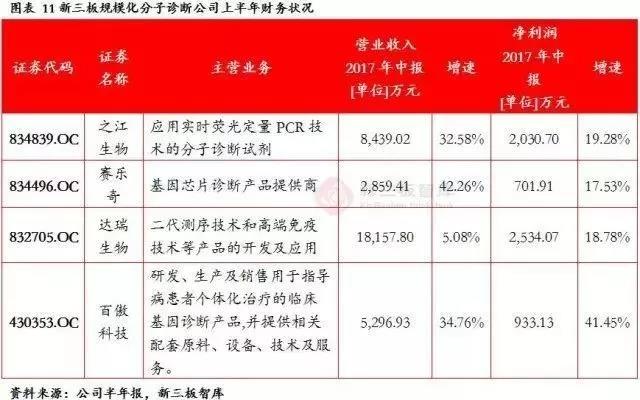 新三板分子诊断领域2017年上半年净利润500万元以上的有4家企业,分别是之江生物、赛乐奇、达瑞生物和百傲科技,其主营业务和财务表现如下表所示。