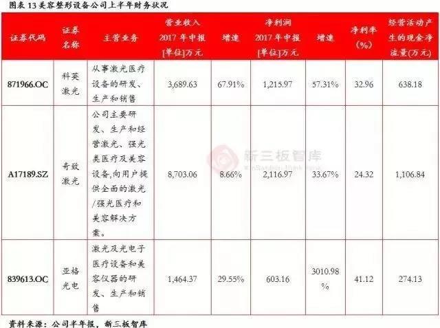 医疗美容设备及仪器作为新三板的特色领域,2017年业绩增长强劲。从行业的角度来讲,医疗美容近年来持续快速发展,受益于人们对美容需求的逐步提升和消费支出意愿的不断加强,下游医疗美容服务机构扩张迅速,对医疗美容设备需求大幅提升,市场容量急剧扩张。因此,近年来医疗美容设备公司发展迅速,从17年半年业绩表现来看,总体收入利润规模、盈利能力、现金流等方面均突出行业的优质属性,且奇致激光公司已经进行了辅导备案。整个行业未来发展前景光明,看好此板块未来业绩的表现。