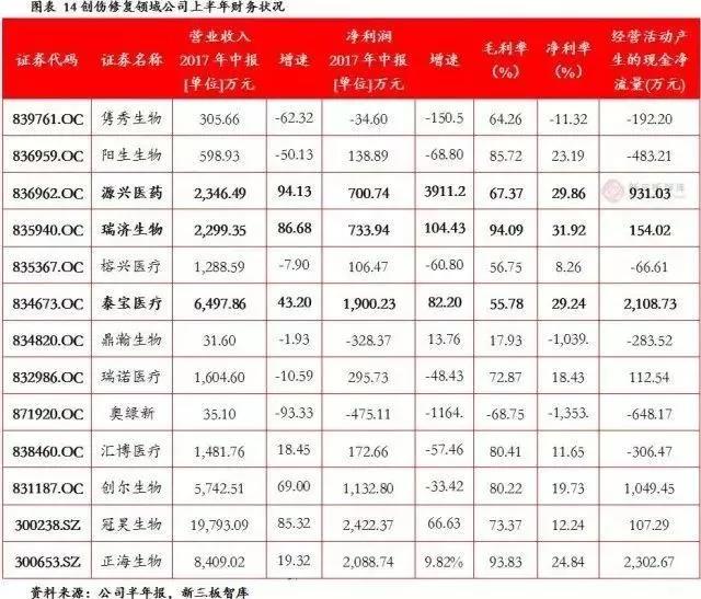 创伤修复领域医疗器械主要包括各类医用敷料、生物再生材料等。新三板从事相关业务的公司很多,共有11家,A股共有3家,港股一家,排队IPO的一家。其中A股南卫股份、港股普华和顺和排队IPO的稳健医疗并未披露半年报,因此统计数据来自于剩下的13家公司。